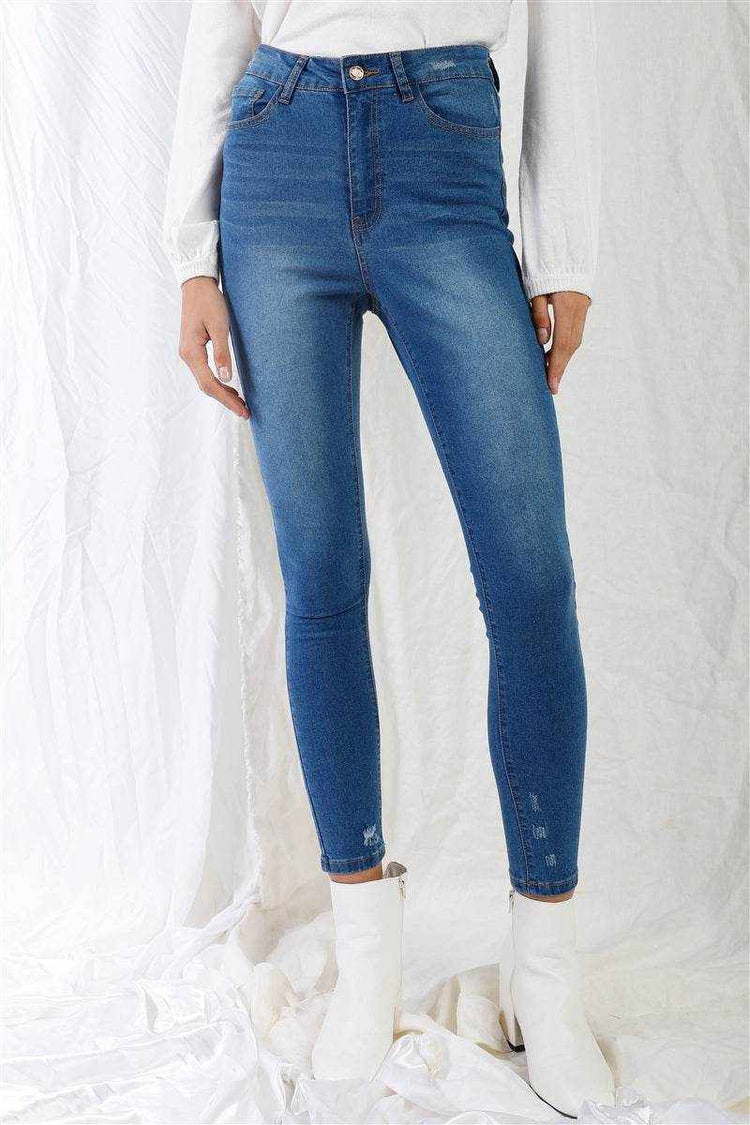 Add our Mid Blue High-waisted With Rips Skinny Denim Jeans to your cart now and embrace the perfect blend of fashion and comfort!