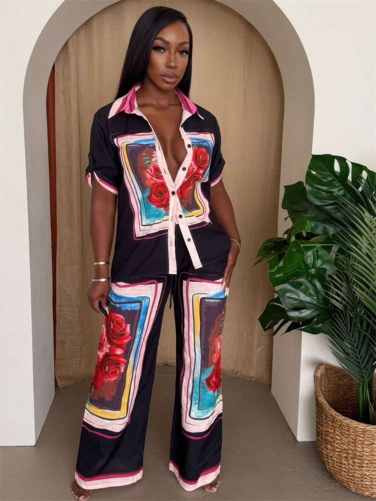 Bold and refined, the Midnight Bloom Framed Resort Set captures the perfect balance of edge and elegance. Set against a deep black base, vivid red rose artwork is framed in colorful panels, creating a visually striking look with a romantic touch. The lightweight button-up top pairs effortlessly with the matching wide-leg pants, both designed with a relaxed fit for all-day comfort. Whether you're lounging at a luxury resort or dressing up for a sunset dinner, this set delivers elevated style with minimal effort.